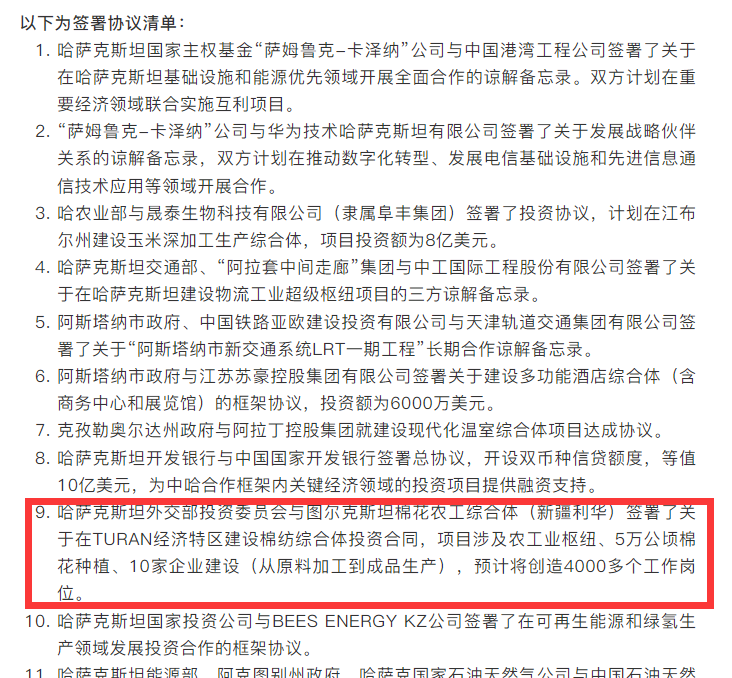 投资清单显示,新疆利华集团将在突厥斯坦地区投资4.2亿美元打造完整的棉花产业集群,涵盖种植、加工、纺织三大环节,计划建设10家企业,带动4000人就业。